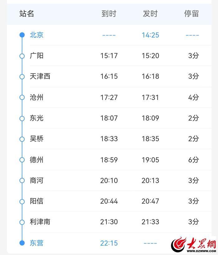 自6月26日起,“北京丰台站”至“东营站”的K1785次列车,调整恢复至“北京站”始发,“北京站”发车时刻为14:25,不再停靠“北京丰台站”,抵达终点站“东营站”时刻为22:15。该列车具体到发时刻如下: